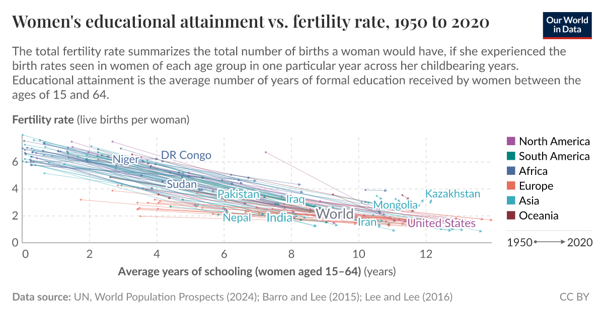 https://ourworldindata.org/grapher/womens-educational-attainment-vs-fertility?time=1950..2020너무 大騒ぎするな、世界的な低出生率であることは、ちょうど世界的なトレンドだイスラム諸国も今1点台に突入するイランが ㅅㅂ 1.2であるただの類人猿ニジェール、チャド、ナイジェリア、このような猿のM黒を除いて、残りの部分だけ、全世界が落ちるのが当然のことである人類が発展するので、人類が発展したら
